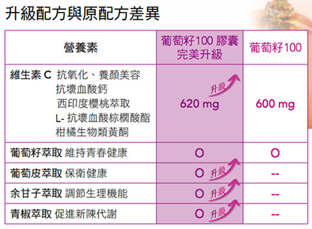 蘊含葡萄籽、葡萄皮、余甘子、青椒萃取、生物類黃酮及維生素C,具有抗氧化作用,促進膠原蛋白的形成,並有助於維持細胞排列的緊密性。有助於維持循環健康,徹底調整體質,輕鬆駕馭時光。