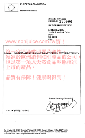 在經過多年的測試及研究後,歐盟委員會證實美商大溪地諾麗公司所生產的大溪地諾麗®果汁其安全性,於是正式核准大溪地諾麗果汁得以在歐洲以『新穎食品』型態銷售,成為第一家獲准於歐洲銷售noni產品的公司。為了通過歐盟嚴峻的核准條件,美商大溪地諾麗公司花費許多時間及金錢為產品進行嚴格的檢測,並通過許多檢測的考驗,證明大溪地諾麗®果汁的確是天然、安全、絕無污染的。